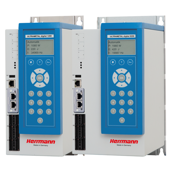 适用于间歇焊接的强大超声波发生器 - ULTRAMETAL digital 产品系列具有 20 kHz、35 kHz 的操作频率,功率范围为 1200 W 到 6200 W。该产品系列具有多种特性,其中包括可编程的起振时间和衰减时间以及连续振幅调节。所有 Herrmann Ultraschall 标准机和标准系统中均集成 ULTRAMETAL digital 超声波发生器。